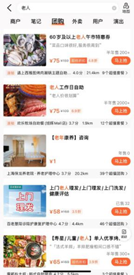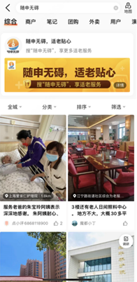 经过一系列产品升级,在大众点评搜索“随申无碍”,即可进入“聚合入口”,包括餐食、居家照护、老人摄影、家庭局部适老改造、养老机构、心理咨询等海量服务,覆盖了老人生活的方方面面。此外,搜索“老人”,点击团购按钮,还有针对老人的优惠套餐,真正做到“随申无碍,适老贴心”。